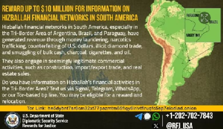 Por otra parte, esta semana el programa Recompensas de la Justicia (RFJ) de Estados Unidos anunció oficialmente una retribución de hasta 10 millones de dólares “por información que conduzca a la interrupción de los mecanismos de financiación de la organización terrorista Hezbollah. En el marco de esta oferta, RFJ solicita información sobre las redes financieras de Hezbollah en la zona de la Triple Frontera entre Argentina, Brasil y Paraguay”.